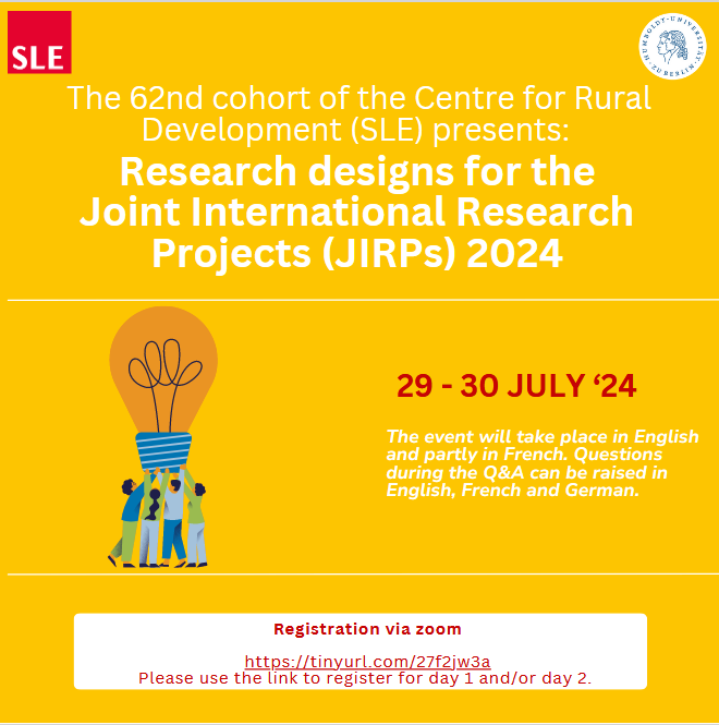Invitation: Research Designs for the JIRP Projects 2024 Termine Invitation: Research Designs for the JIRP Projects 2024 July 8, 2024 The 62nd cohort of the Centre for Rural Development (SLE) presents: Research designs for the Joint International Research Projects (JIRPs) 2024